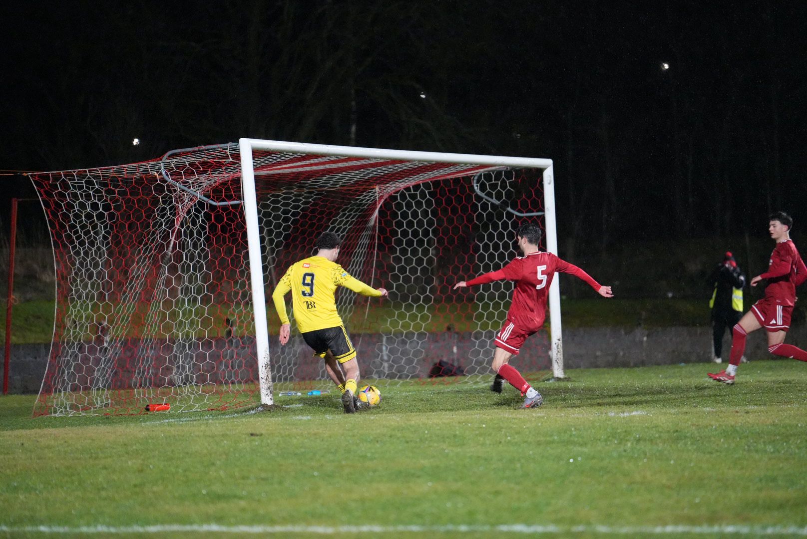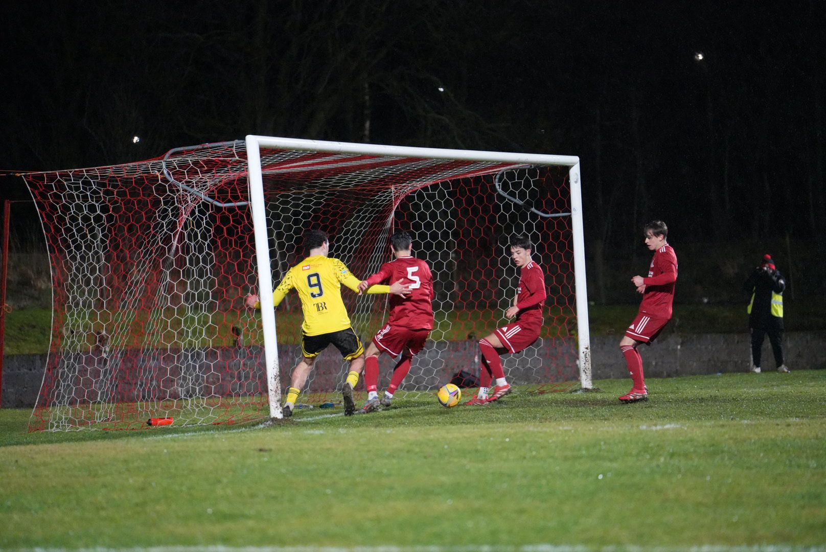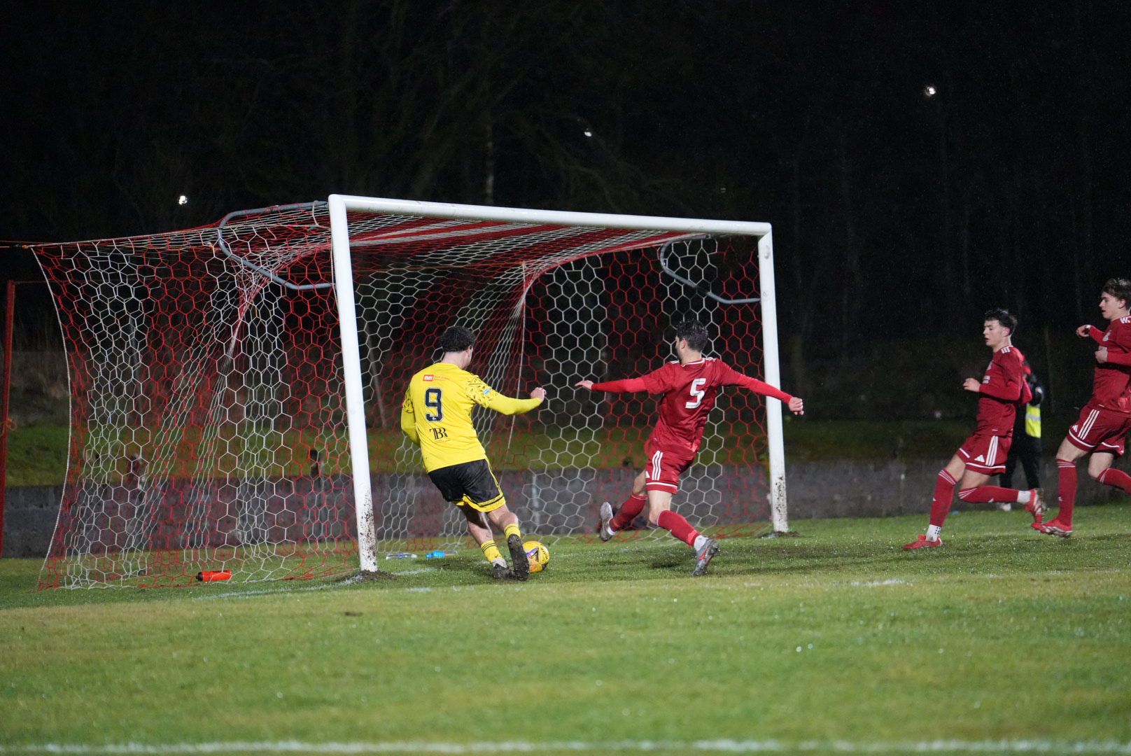 Glenafton Athletic had barely threatened in the first half but came close to levelling the match as Glens number 5, Ollie Rowe, produced a powerful shot 40 yards from goal that flew just wide of Burgh goalkeeper, Luke Scullion's, left hand post after 35 minutes.